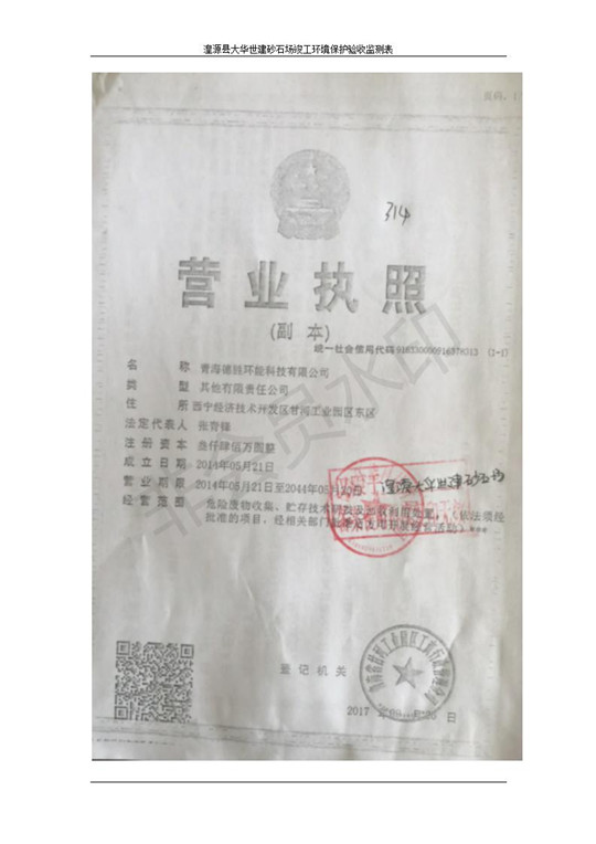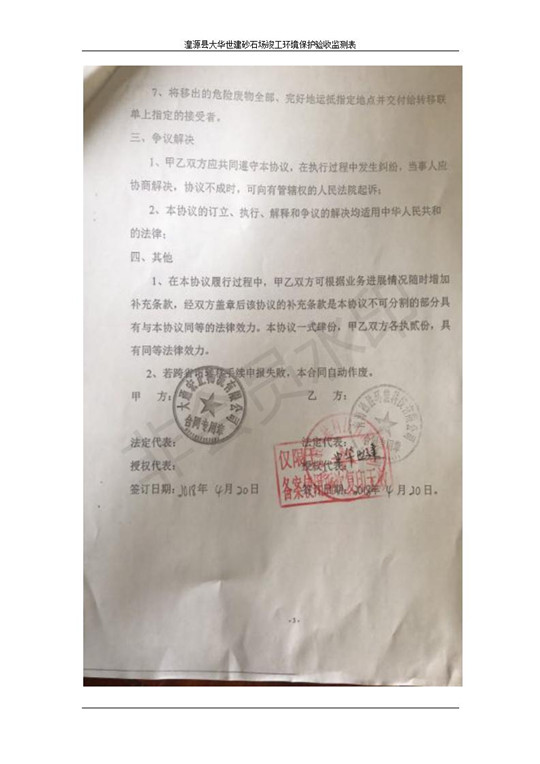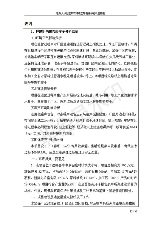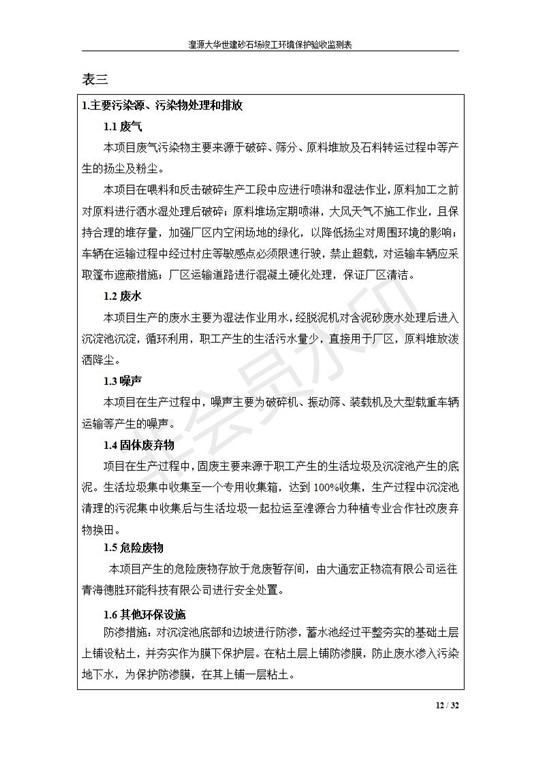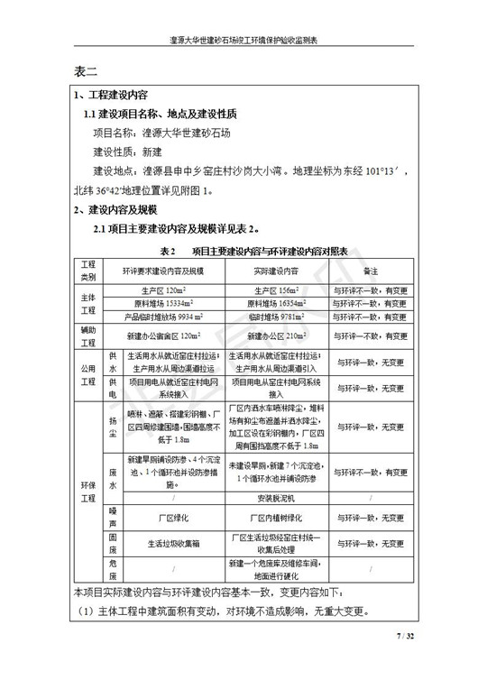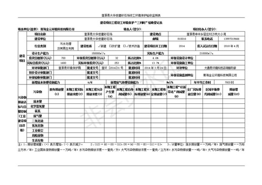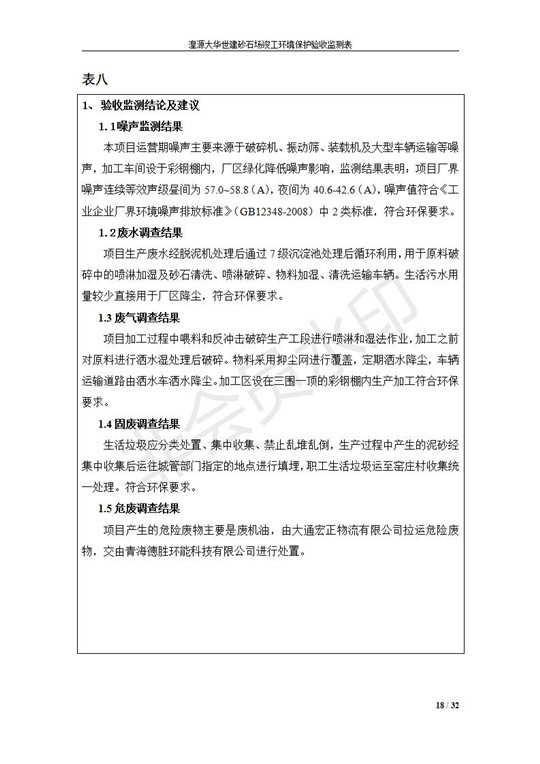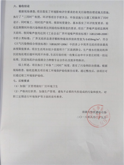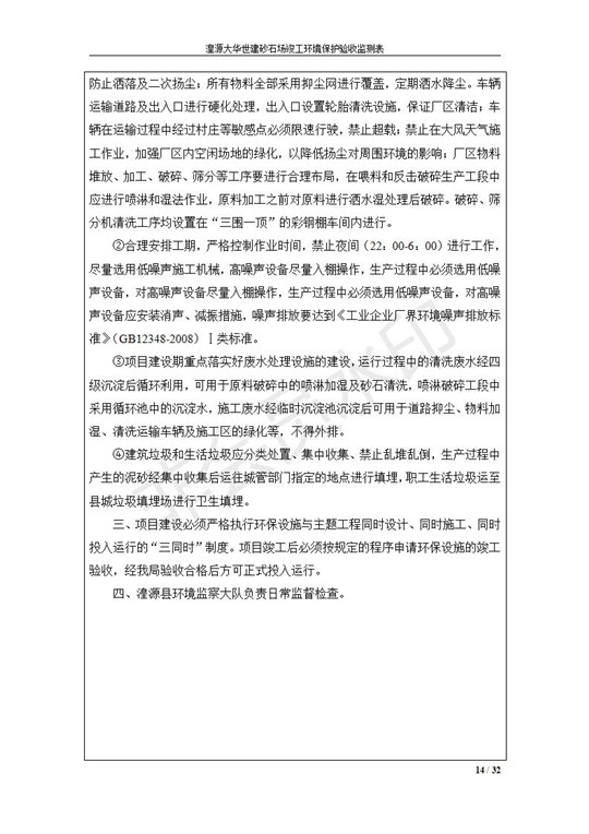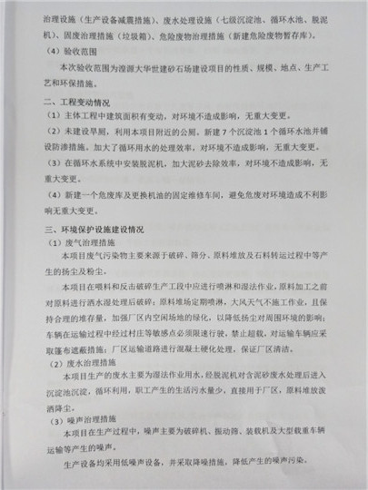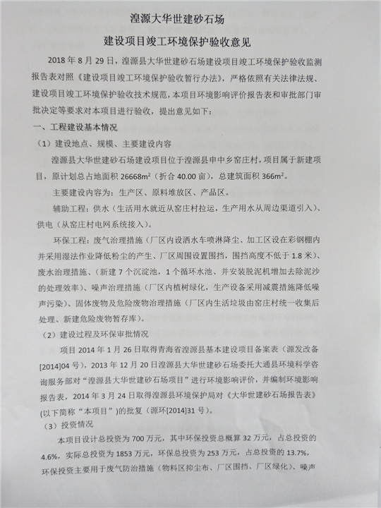 根據(jù)中華人民共和國(guó)國(guó)務(wù)院令第253號(hào)《建設(shè)項(xiàng)目環(huán)境保護(hù)管理?xiàng)l例》(中華人民共和國(guó)國(guó)務(wù)院令第682號(hào)《國(guó)務(wù)院關(guān)于修改〈建設(shè)項(xiàng)目環(huán)境保護(hù)管理?xiàng)l例〉的決定》和《建設(shè)項(xiàng)目竣工環(huán)境保護(hù)驗(yàn)收暫行辦法》,嚴(yán)格依照有關(guān)法律法規(guī),建設(shè)項(xiàng)目環(huán)境保護(hù)設(shè)施驗(yàn)收技術(shù)規(guī)范,本項(xiàng)目環(huán)評(píng)報(bào)告表和環(huán)保審批部門(mén)審批意見(jiàn)以及企業(yè)自行驗(yàn)收相關(guān)要求等對(duì)本項(xiàng)目進(jìn)行驗(yàn)收,本項(xiàng)目符合環(huán)保驗(yàn)收條件,可以通過(guò)環(huán)保驗(yàn)收。 湟源大華世建砂石場(chǎng)建設(shè)項(xiàng)目竣工環(huán)境保護(hù)驗(yàn)收意見(jiàn).