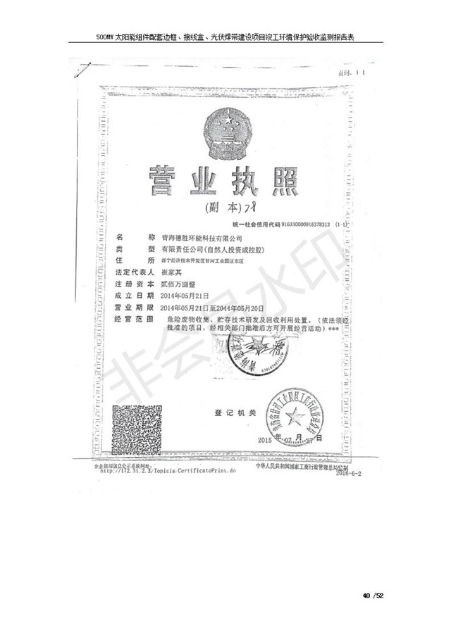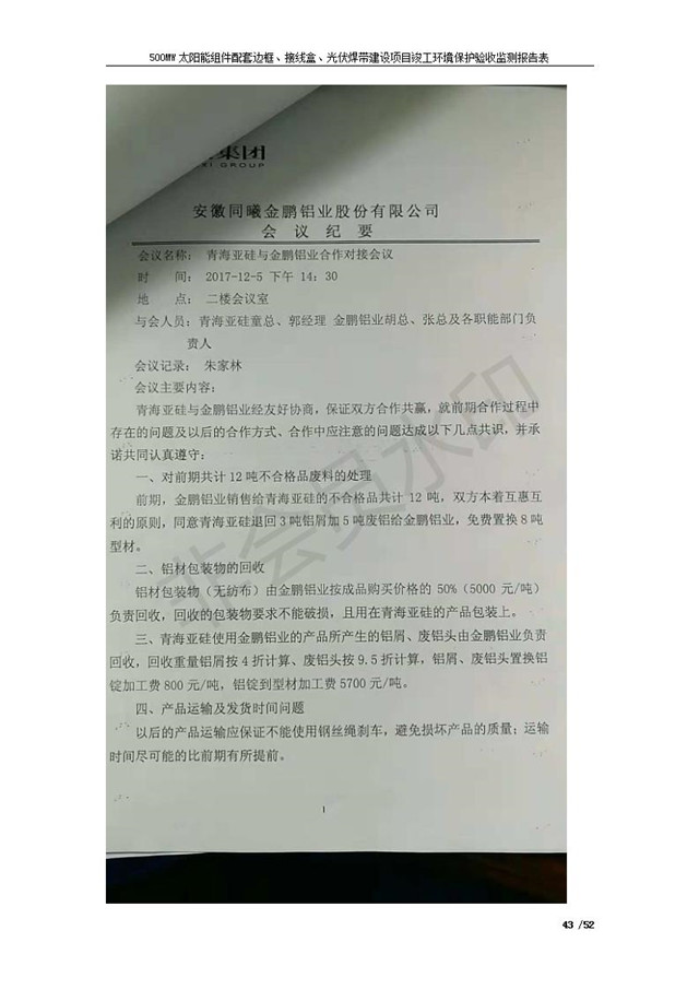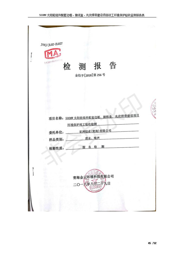500MW太陽能組件配套邊框、接線盒、光伏焊帶建設(shè)項(xiàng)目竣工環(huán)境保護(hù)驗(yàn)收監(jiān)測報(bào)告表公示發(fā)布日期:(2018-11-16) 點(diǎn)擊次數(shù):2264 |