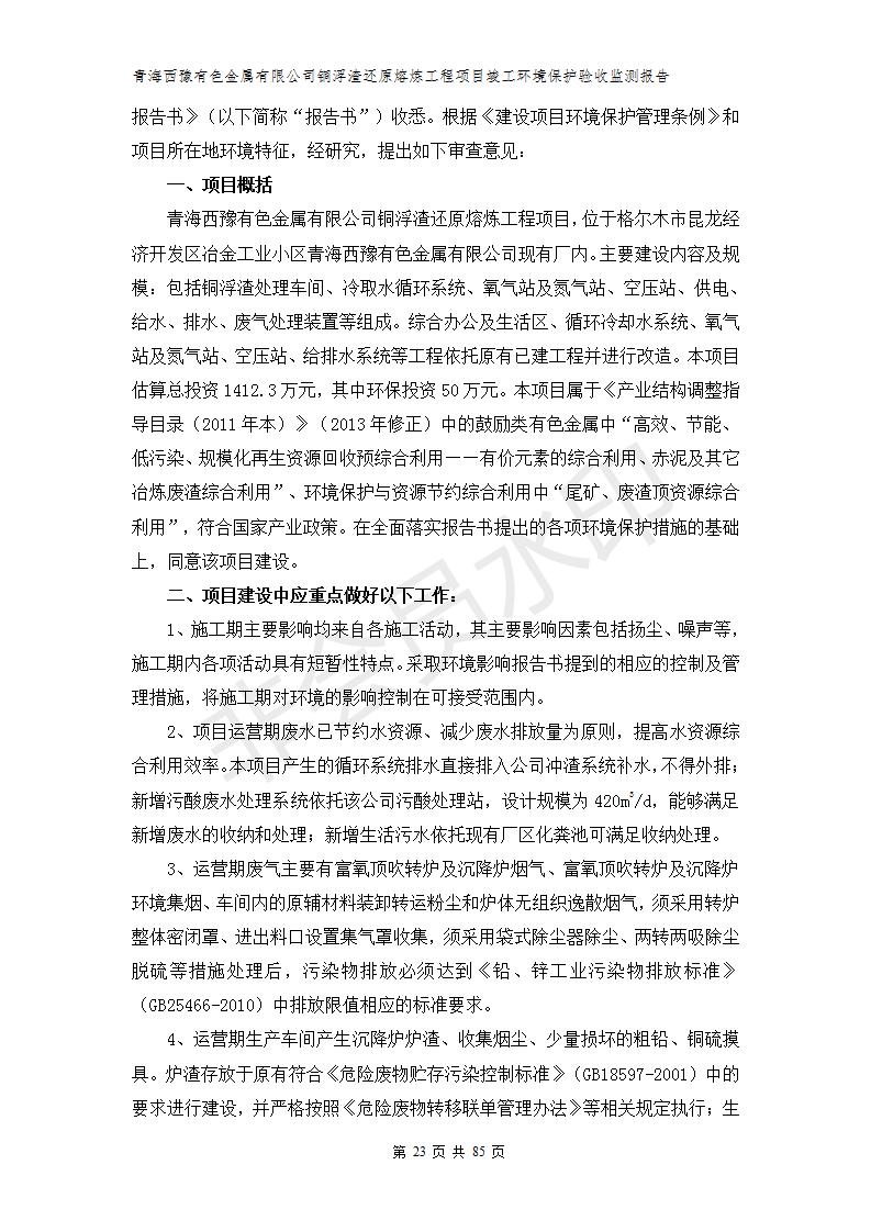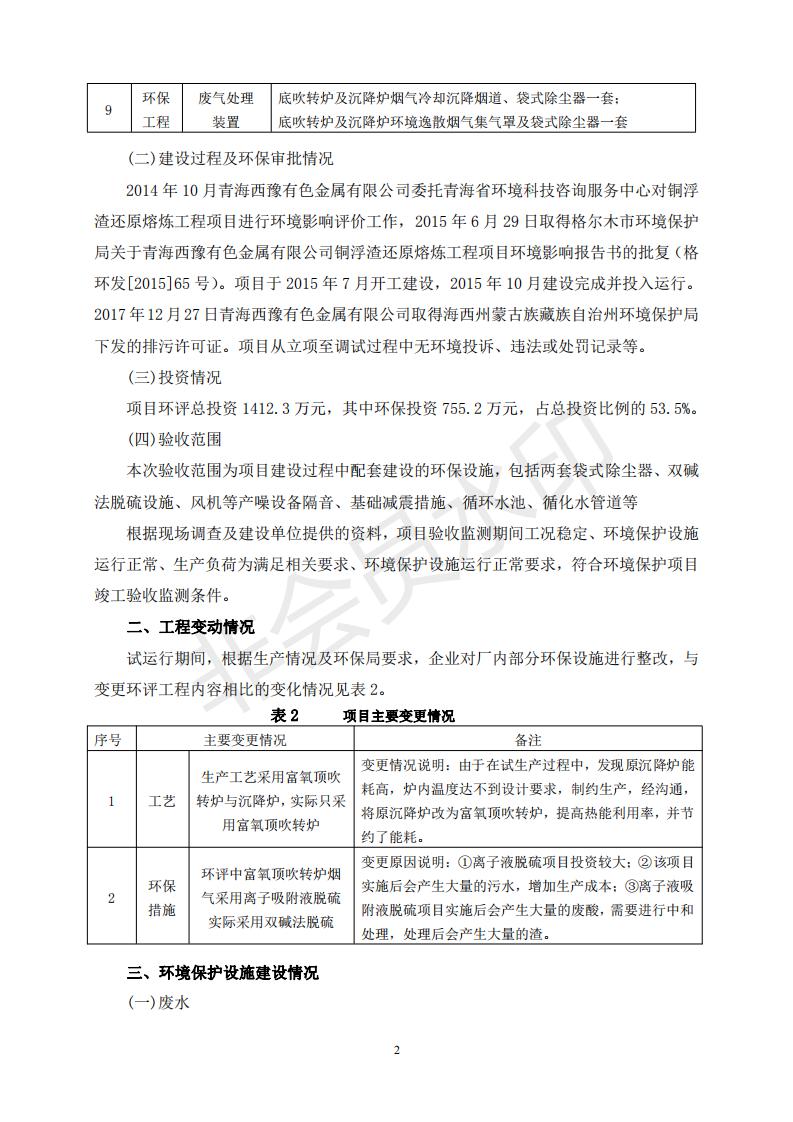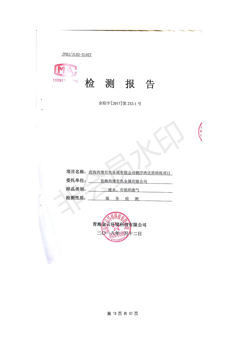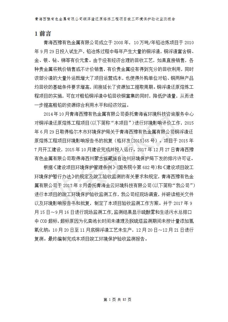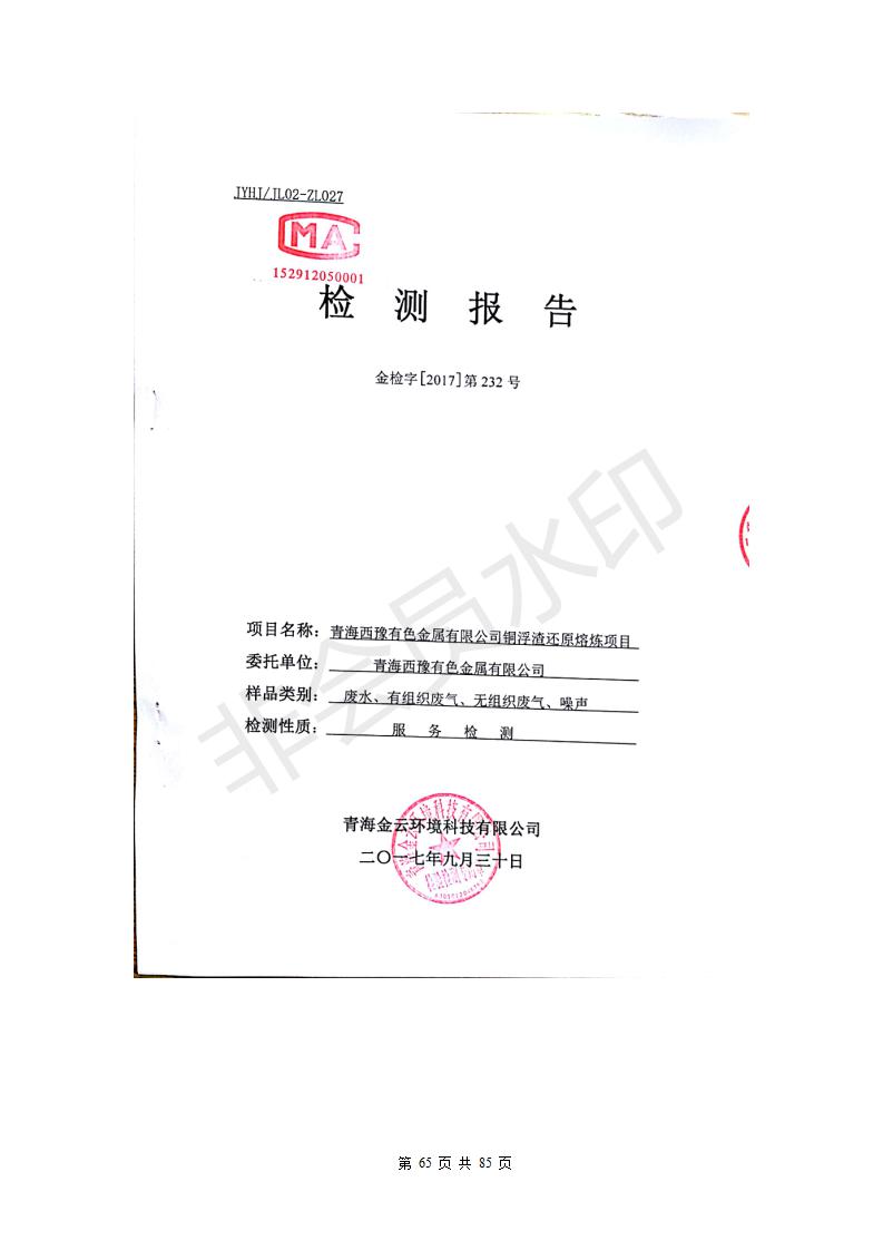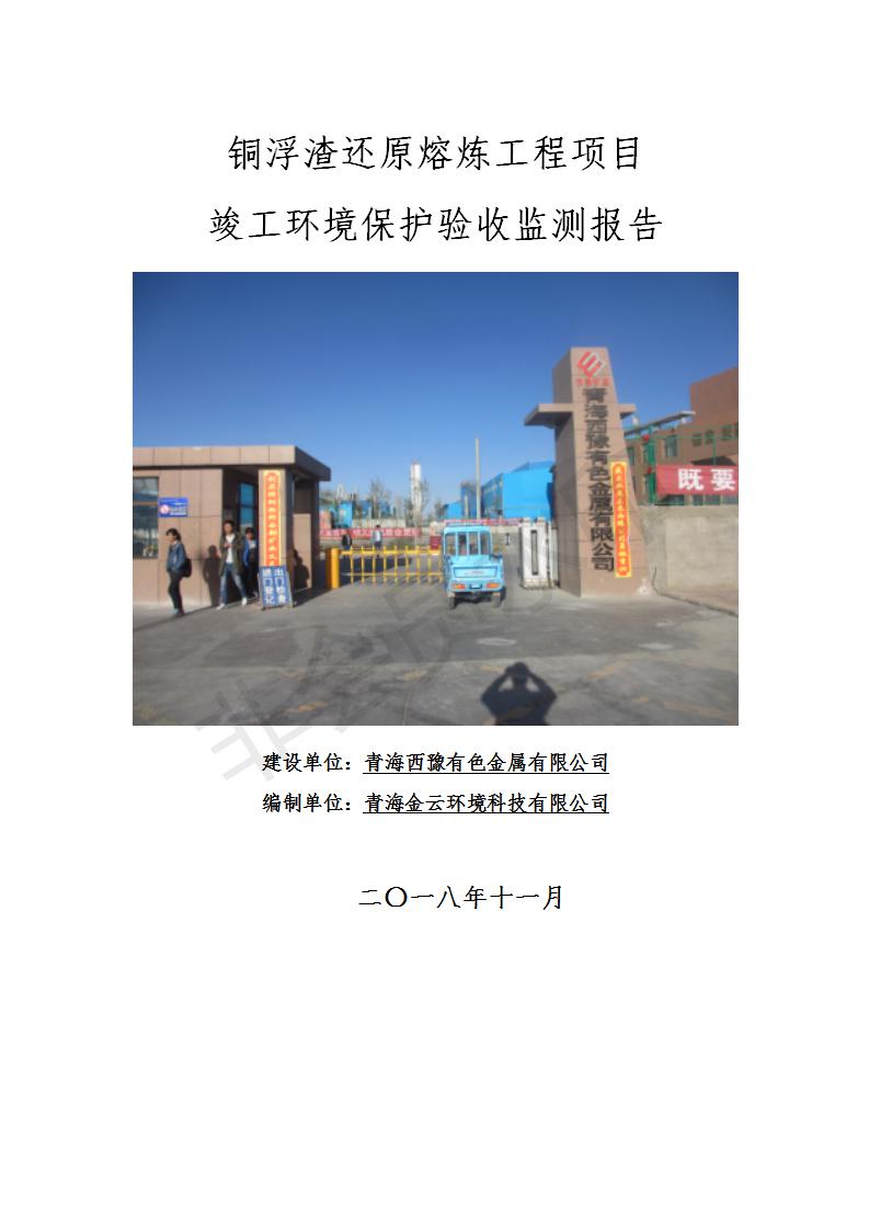 青海西豫有色金屬有限公司銅浮渣還原熔煉工程項(xiàng)目竣工環(huán)境保護(hù)驗(yàn)收監(jiān)測(cè)報(bào)告公示發(fā)布日期:(2018-11-23) 點(diǎn)擊次數(shù):2784 |