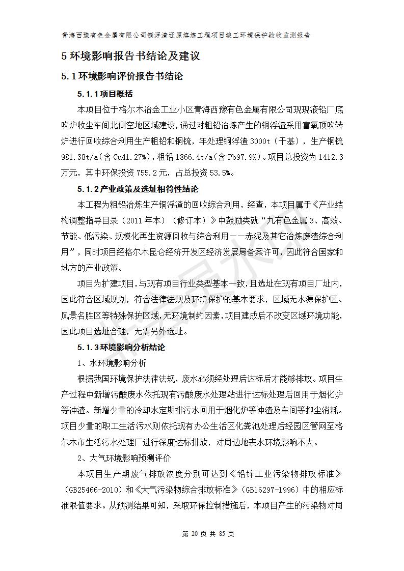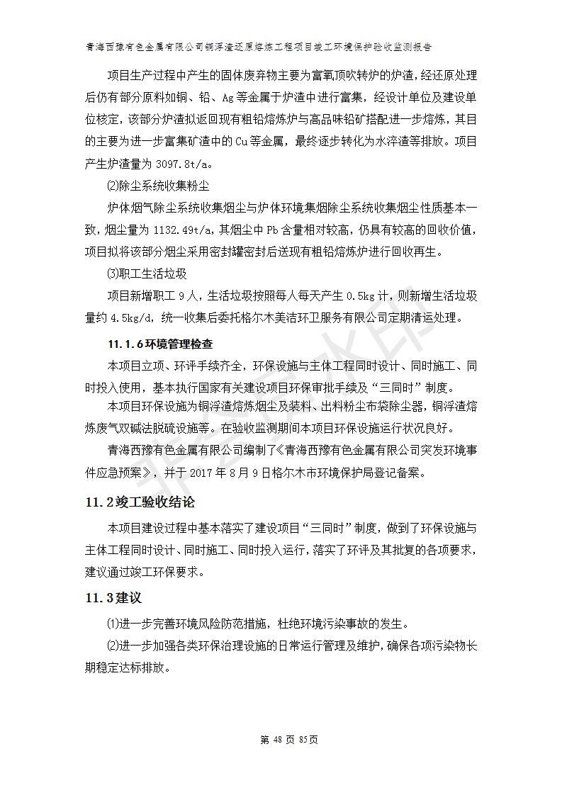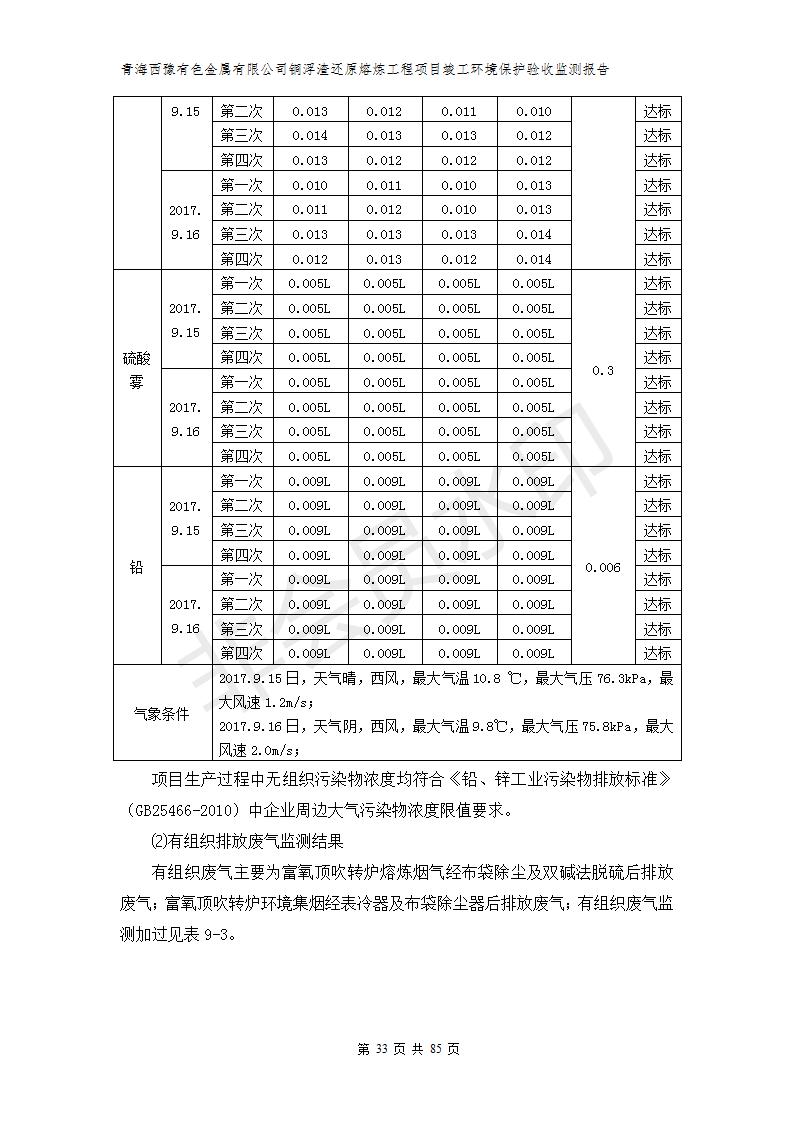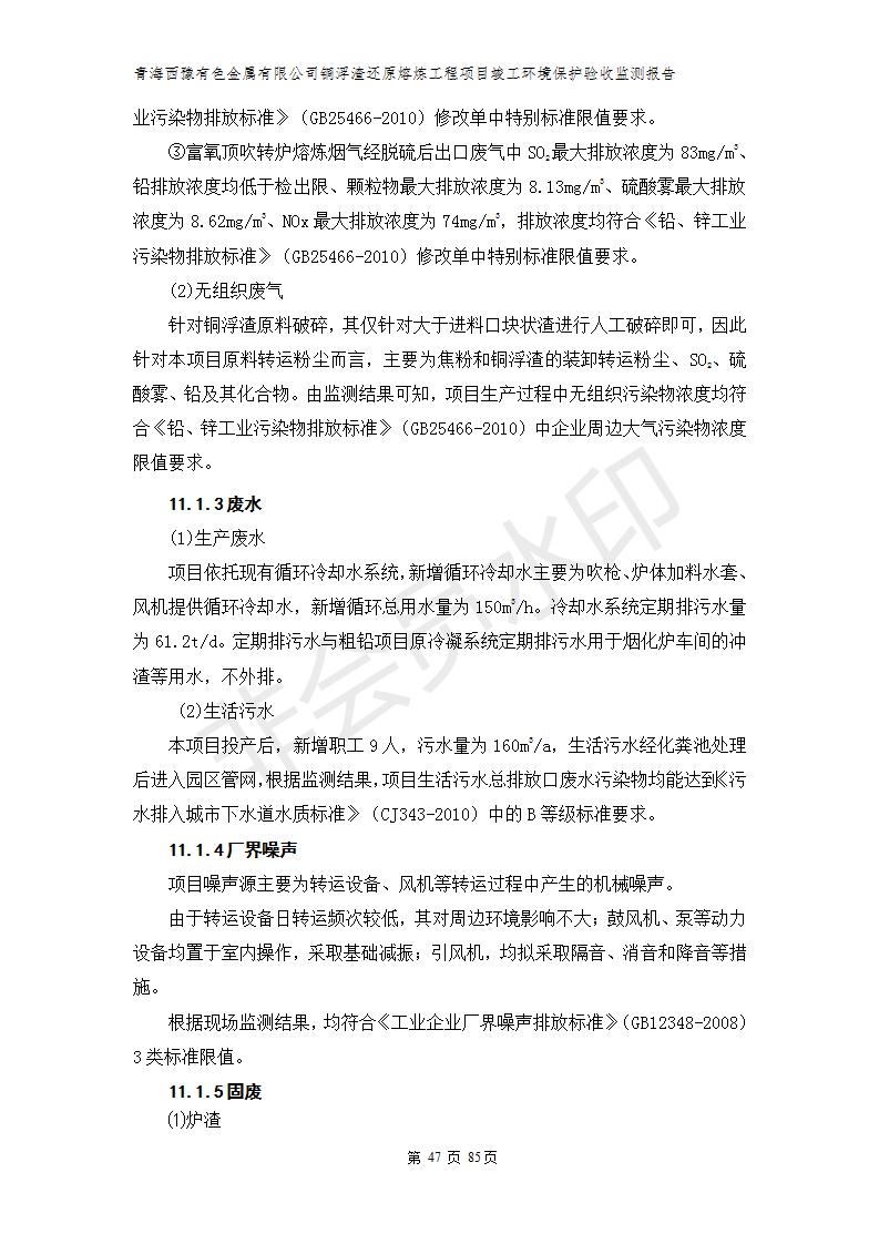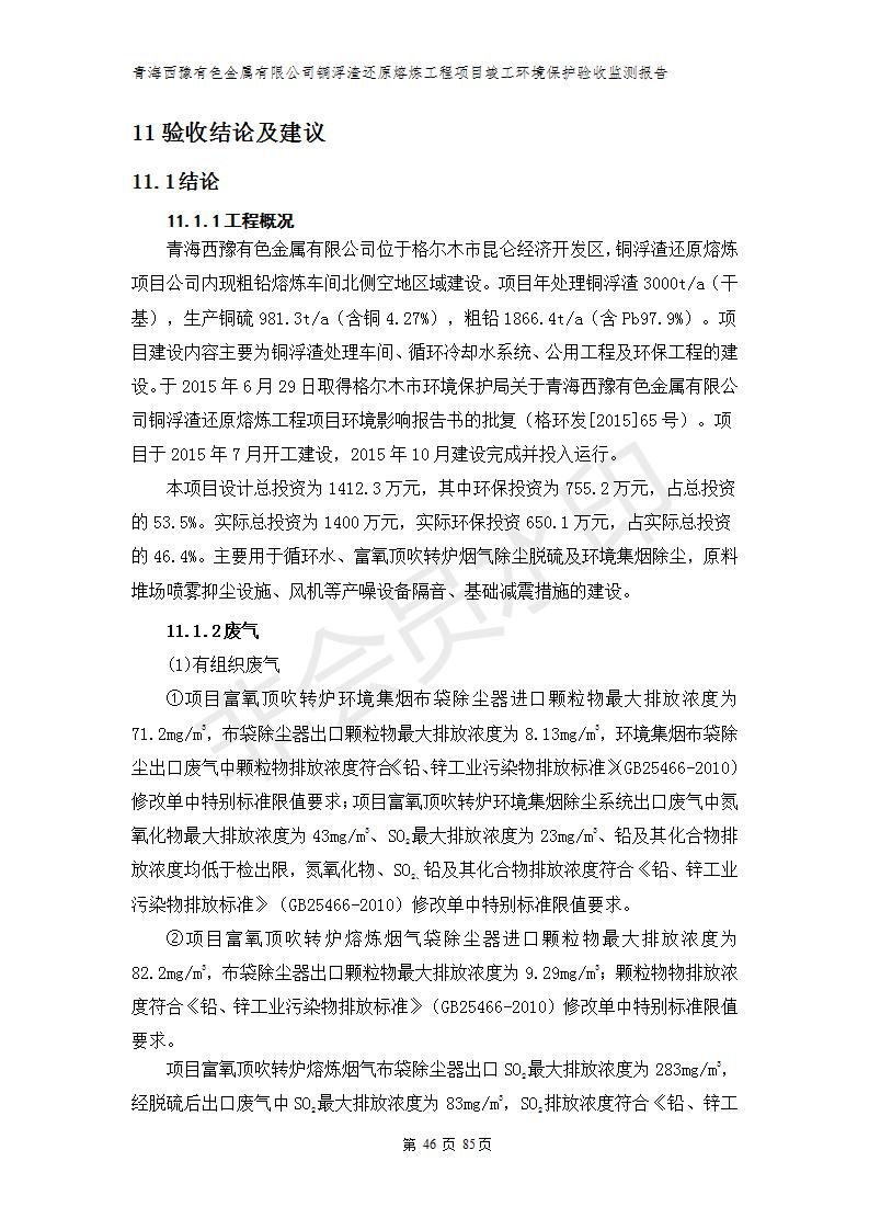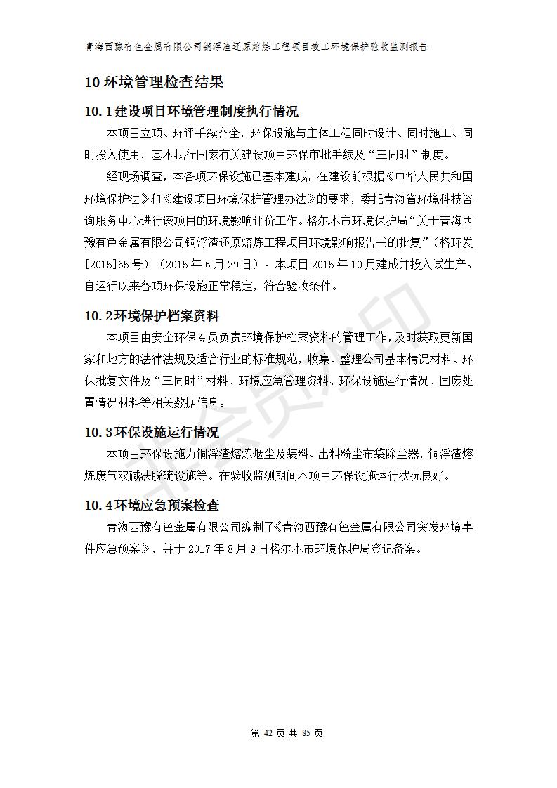 青海西豫有色金屬有限公司銅浮渣還原熔煉工程項(xiàng)目竣工環(huán)境保護(hù)驗(yàn)收監(jiān)測(cè)報(bào)告公示發(fā)布日期:(2018-11-23) 點(diǎn)擊次數(shù):2784 |