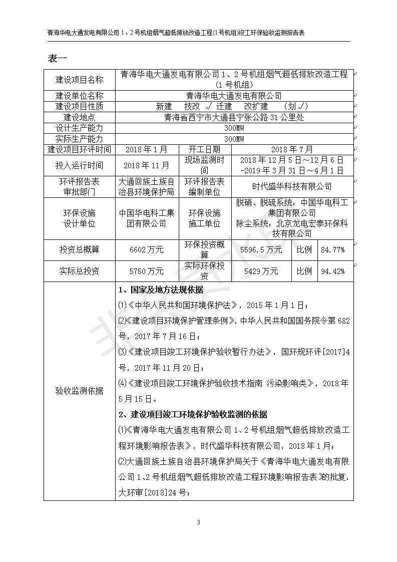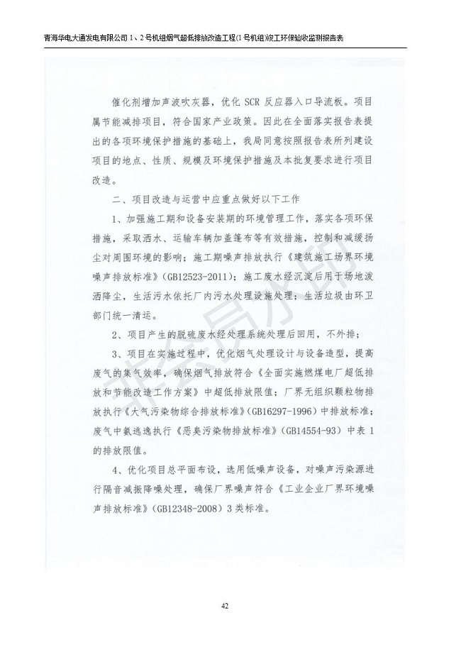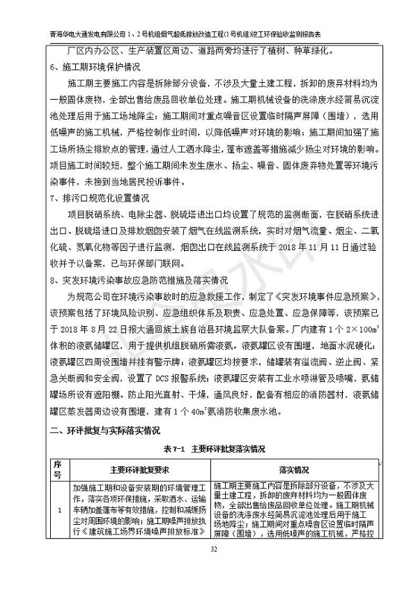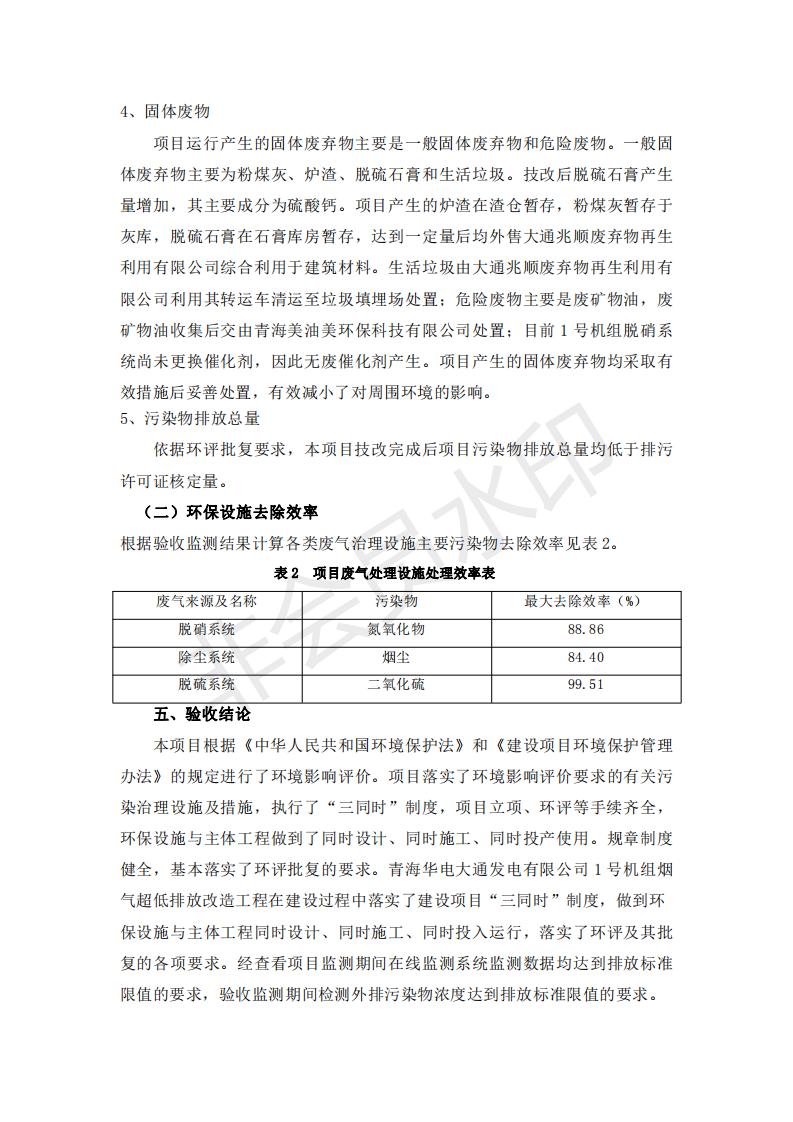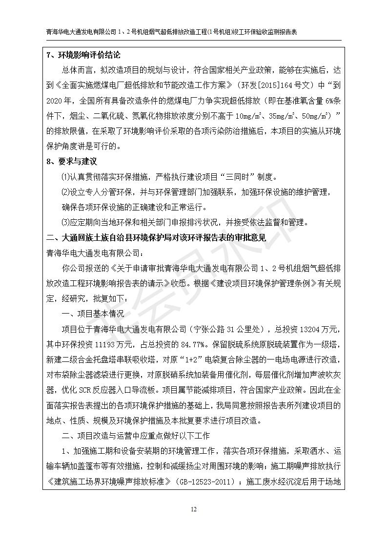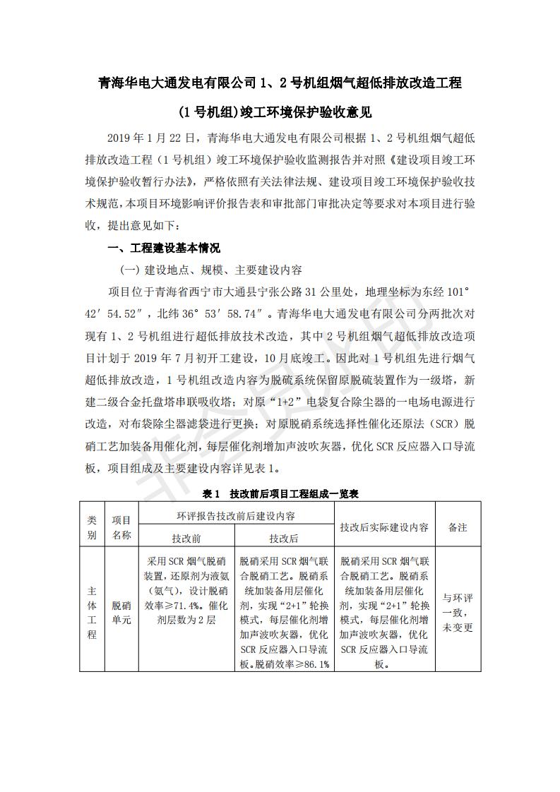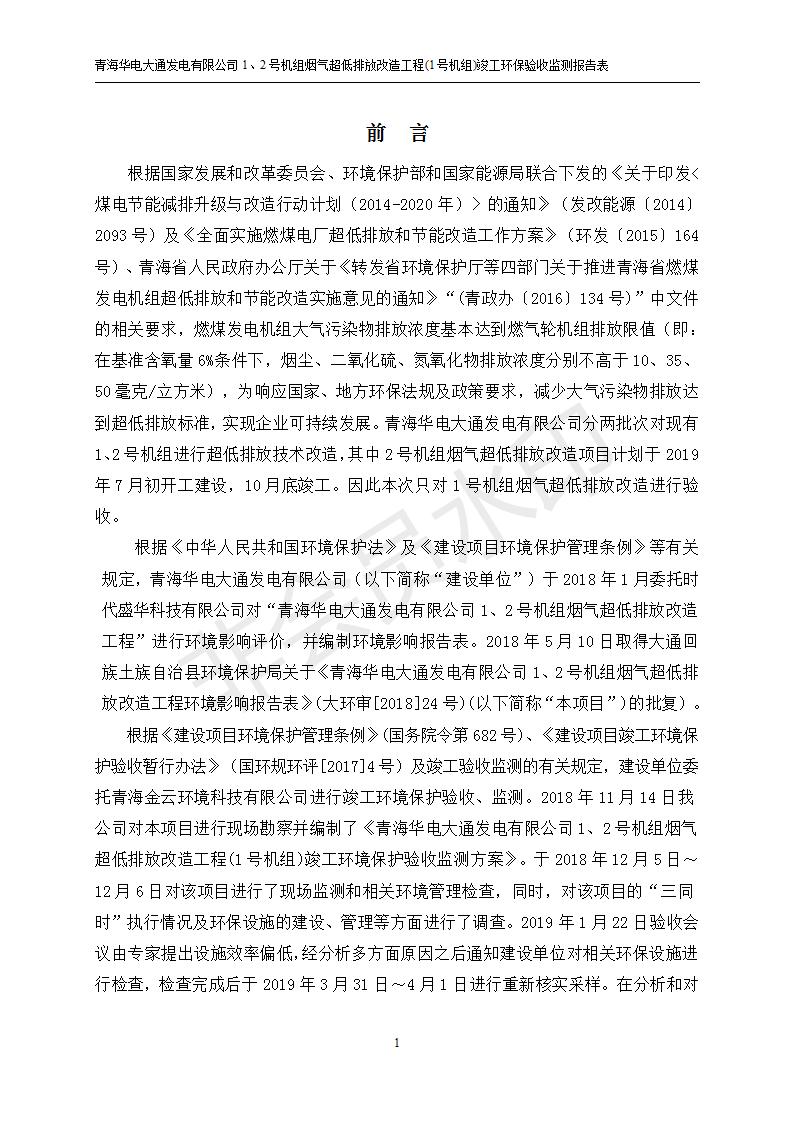 根據(jù)中華人民共和國(guó)國(guó)務(wù)院令第682號(hào)《國(guó)務(wù)院關(guān)于修改〈建設(shè)項(xiàng)目環(huán)境保護(hù)管理?xiàng)l例〉的決定》和《建設(shè)項(xiàng)目竣工環(huán)境保護(hù)驗(yàn)收暫行辦法》(國(guó)務(wù)院令682號(hào)),青海華電大通發(fā)電有限公司1、2號(hào)機(jī)組煙氣超低排放改造工程(1號(hào)機(jī)組) (包括竣工環(huán)境保護(hù)驗(yàn)收監(jiān)測(cè)報(bào)告表和驗(yàn)收意見(jiàn))公示如下。 一、項(xiàng)目名稱(chēng):青海華電大通發(fā)電有限公司1、2號(hào)機(jī)組煙氣超低排放改造工程(1號(hào)機(jī)組) 竣工環(huán)境保護(hù)驗(yàn)收監(jiān)測(cè)報(bào)告表 二、地點(diǎn):青海省西寧市大通縣寧張公路31公里處 三、建設(shè)單位:青海華電大通發(fā)電有限公司 四、建設(shè)內(nèi)容:1號(hào)機(jī)組煙氣超低排放改造,1號(hào)機(jī)組改造內(nèi)容為脫硫系統(tǒng)保留原脫硫裝置作為一級(jí)塔,新建二級(jí)合金托盤(pán)塔串聯(lián)吸收塔;對(duì)原“1+2”電袋復(fù)合除塵器的一電場(chǎng)電源進(jìn)行改造,對(duì)布袋除塵器濾袋進(jìn)行更換;對(duì)原脫硝系統(tǒng)選擇性催化還原法(SCR)脫硝工藝加裝備用催化劑,每層催化劑增加聲波吹灰器,優(yōu)化SCR反應(yīng)器入口導(dǎo)流板。 五、聯(lián)系人:張工 六、聯(lián)系電 話(huà):0971-6515411 七、公示時(shí)間:二〇一九年二月十三日至二〇一九年三月十二日 公示期間,對(duì)上述公示內(nèi)容如有異議,請(qǐng)以書(shū)面形式反饋,個(gè)人須署真實(shí)姓名,單位須加蓋公章。