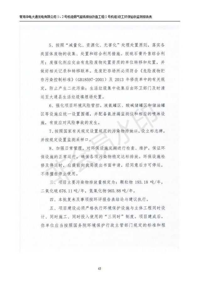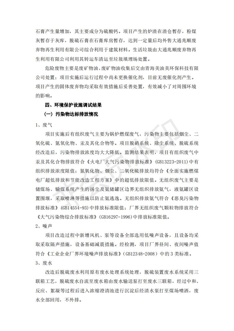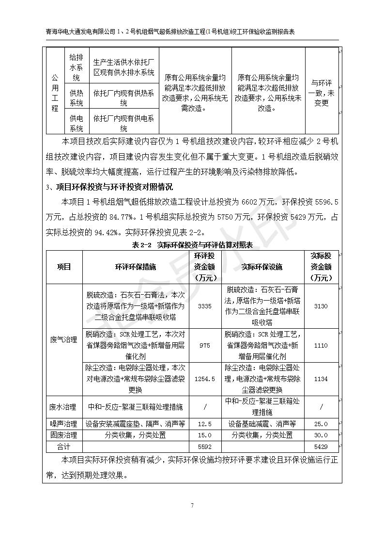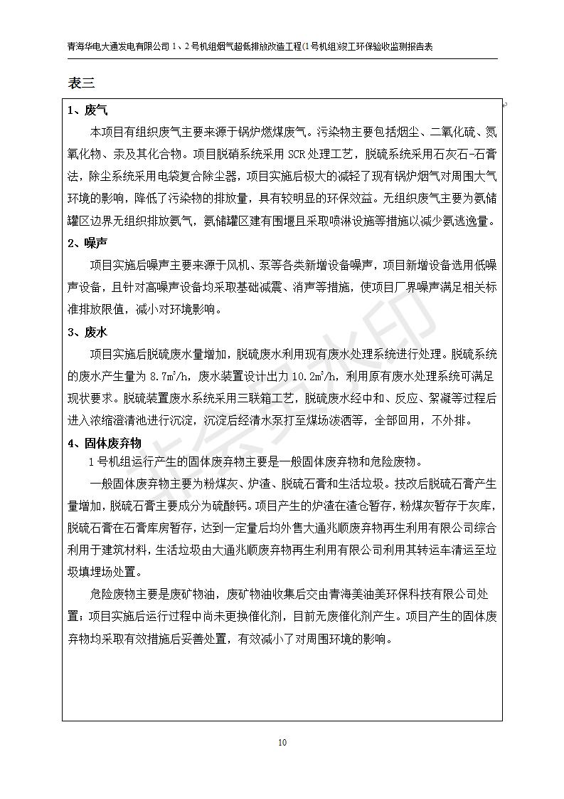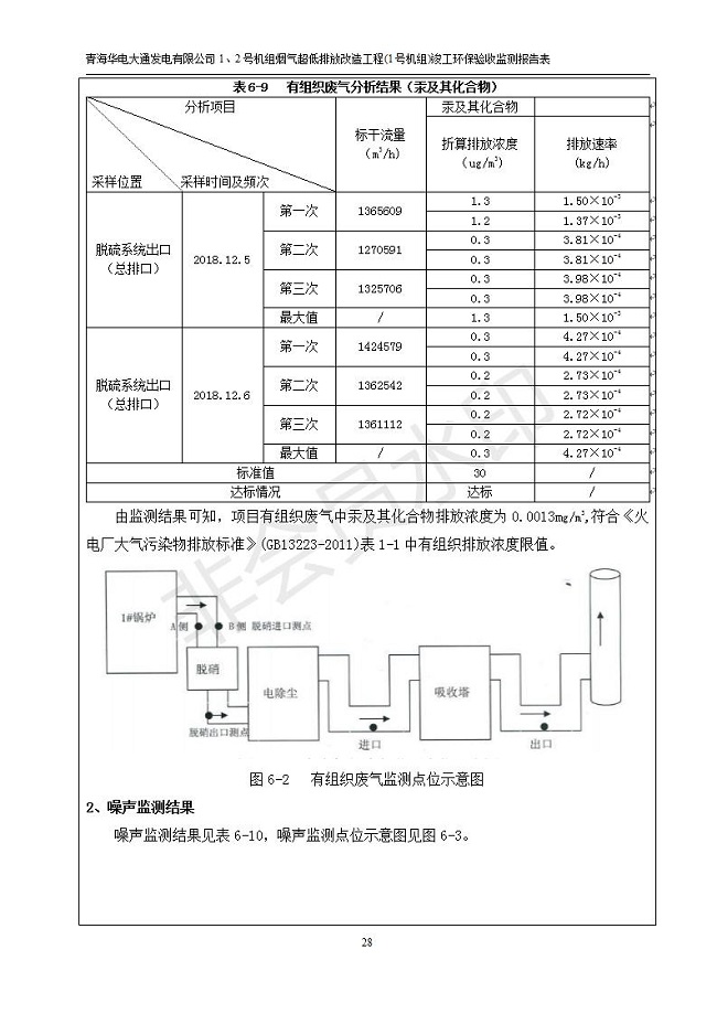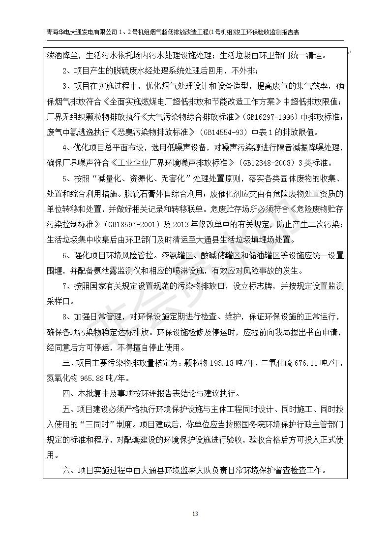 根據(jù)中華人民共和國(guó)國(guó)務(wù)院令第682號(hào)《國(guó)務(wù)院關(guān)于修改〈建設(shè)項(xiàng)目環(huán)境保護(hù)管理?xiàng)l例〉的決定》和《建設(shè)項(xiàng)目竣工環(huán)境保護(hù)驗(yàn)收暫行辦法》(國(guó)務(wù)院令682號(hào)),青海華電大通發(fā)電有限公司1、2號(hào)機(jī)組煙氣超低排放改造工程(1號(hào)機(jī)組) (包括竣工環(huán)境保護(hù)驗(yàn)收監(jiān)測(cè)報(bào)告表和驗(yàn)收意見(jiàn))公示如下。 一、項(xiàng)目名稱(chēng):青海華電大通發(fā)電有限公司1、2號(hào)機(jī)組煙氣超低排放改造工程(1號(hào)機(jī)組) 竣工環(huán)境保護(hù)驗(yàn)收監(jiān)測(cè)報(bào)告表 二、地點(diǎn):青海省西寧市大通縣寧張公路31公里處 三、建設(shè)單位:青海華電大通發(fā)電有限公司 四、建設(shè)內(nèi)容:1號(hào)機(jī)組煙氣超低排放改造,1號(hào)機(jī)組改造內(nèi)容為脫硫系統(tǒng)保留原脫硫裝置作為一級(jí)塔,新建二級(jí)合金托盤(pán)塔串聯(lián)吸收塔;對(duì)原“1+2”電袋復(fù)合除塵器的一電場(chǎng)電源進(jìn)行改造,對(duì)布袋除塵器濾袋進(jìn)行更換;對(duì)原脫硝系統(tǒng)選擇性催化還原法(SCR)脫硝工藝加裝備用催化劑,每層催化劑增加聲波吹灰器,優(yōu)化SCR反應(yīng)器入口導(dǎo)流板。 五、聯(lián)系人:張工 六、聯(lián)系電 話(huà):0971-6515411 七、公示時(shí)間:二〇一九年二月十三日至二〇一九年三月十二日 公示期間,對(duì)上述公示內(nèi)容如有異議,請(qǐng)以書(shū)面形式反饋,個(gè)人須署真實(shí)姓名,單位須加蓋公章。