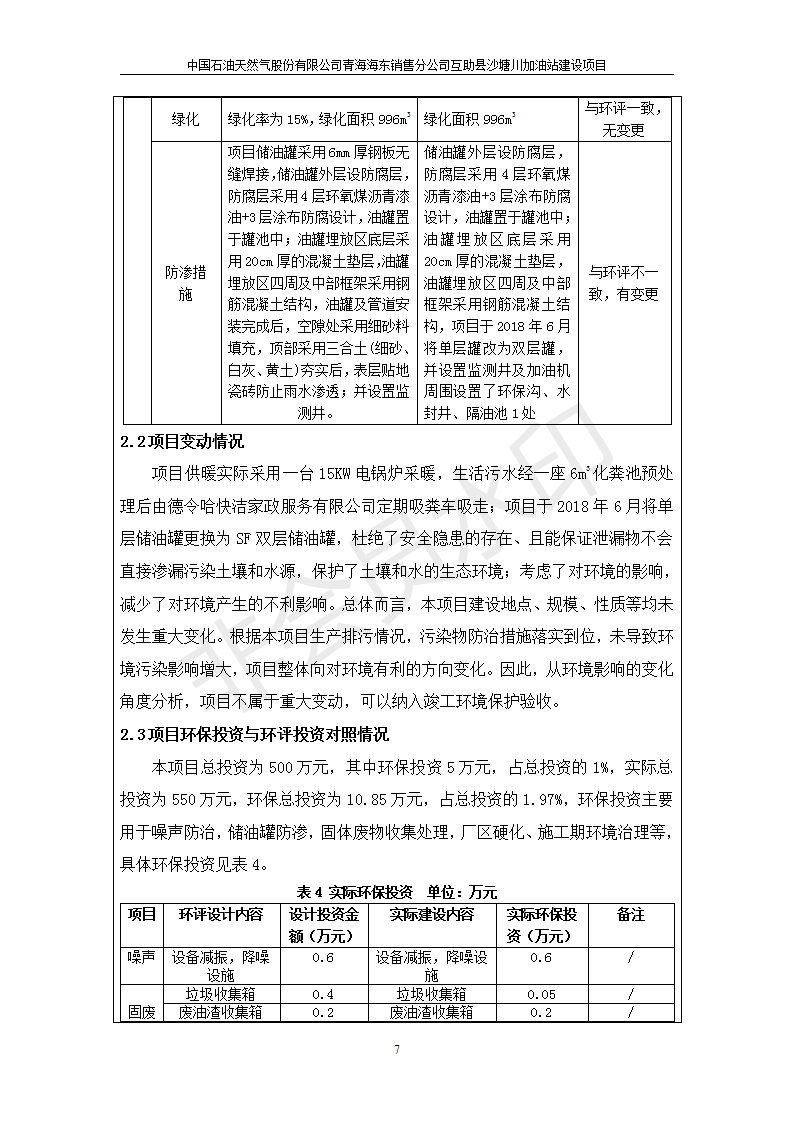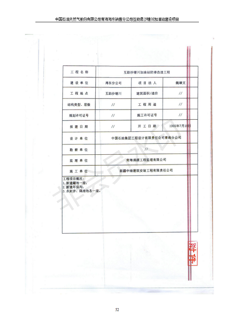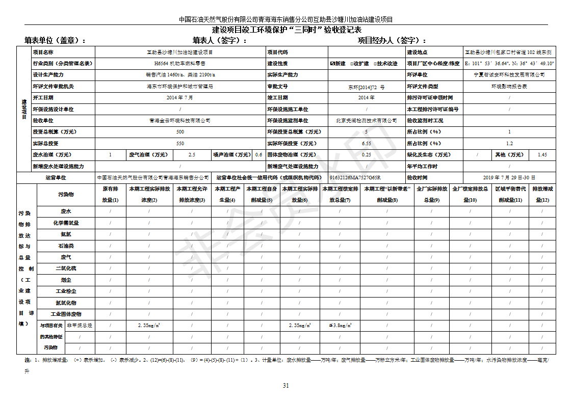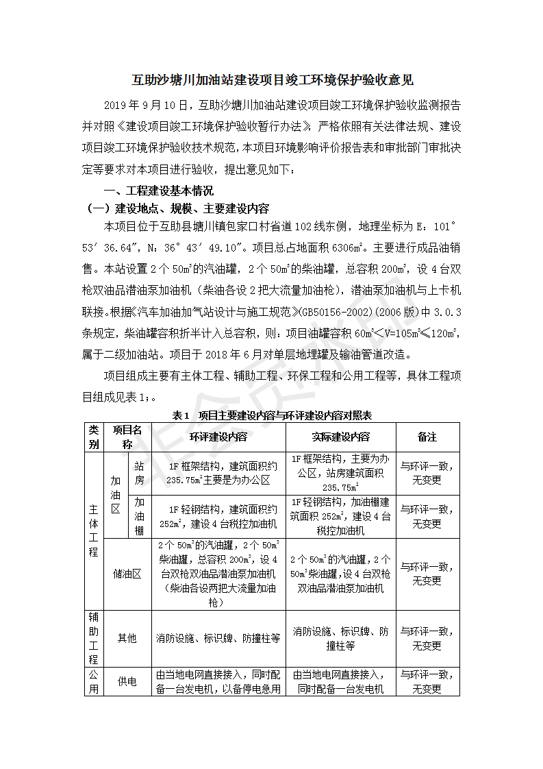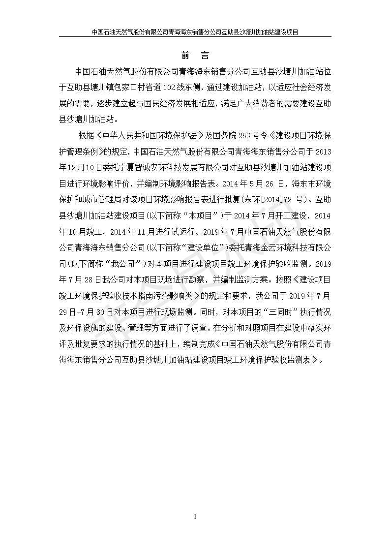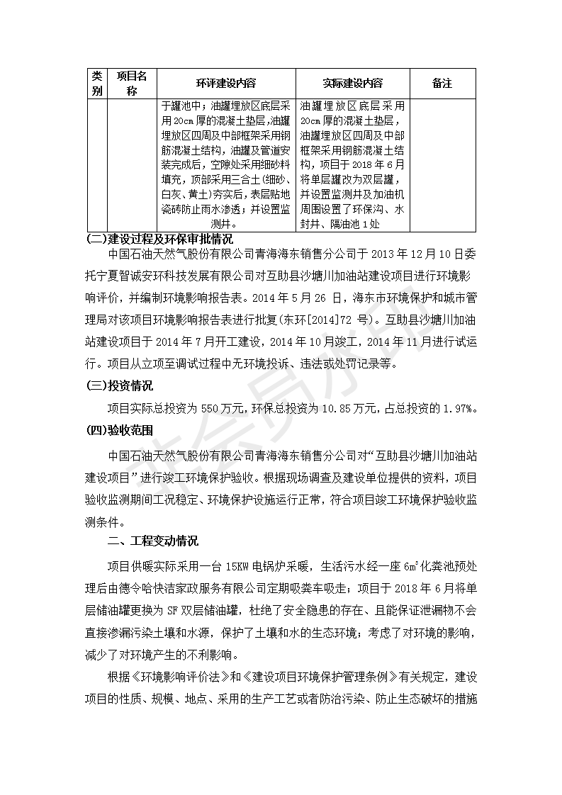 根據(jù)中華人民共和國國務(wù)院令第682號《國務(wù)院關(guān)于修改〈建設(shè)項(xiàng)目環(huán)境保護(hù)管理?xiàng)l例〉的決定》和《建設(shè)項(xiàng)目竣工環(huán)境保護(hù)驗(yàn)收暫行辦法》(國務(wù)院令682號),互助縣沙塘川加油站建設(shè)項(xiàng)目(包括竣工環(huán)境保護(hù)驗(yàn)收監(jiān)測報告表和驗(yàn)收意見)公示如下。 一、項(xiàng)目名稱:互助縣沙塘川加油站建設(shè)項(xiàng)目 二、地點(diǎn):互助縣塘川鎮(zhèn)包家口村 六、聯(lián)系電話:0971-6515411 七、公示時間:二〇一九年九月二十七日至二〇一九年十月二十九日 公示期間,對上述公示內(nèi)容如有異議,請以書面形式反饋,個人須署真實(shí)姓名,單位須加蓋公章。