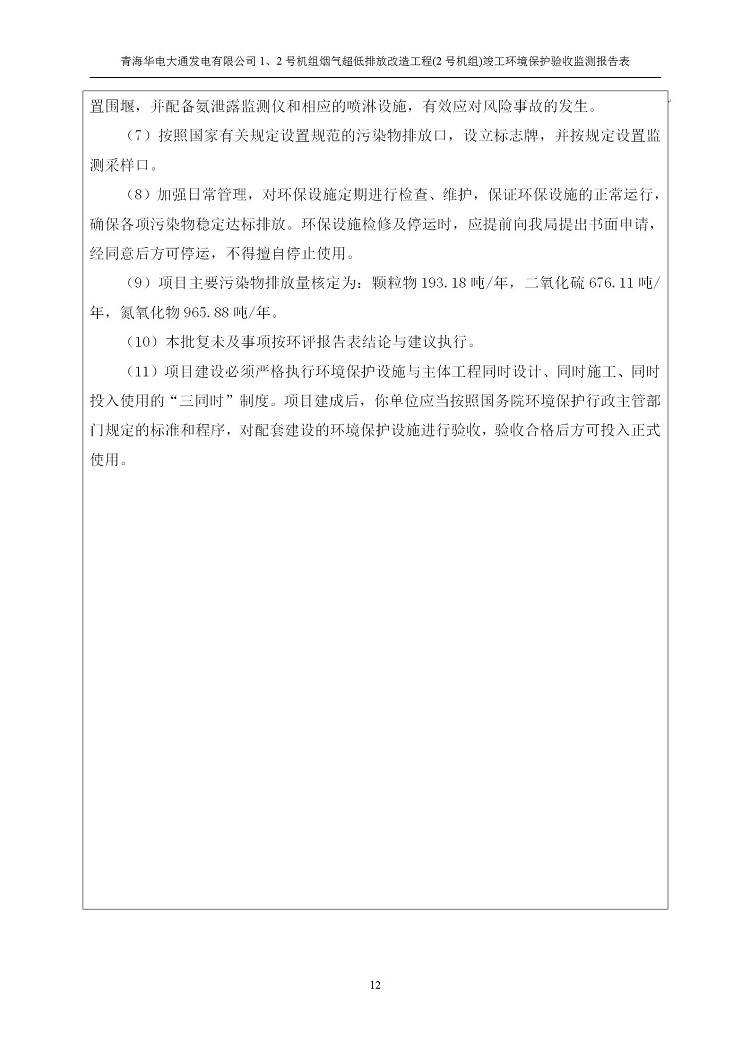 根據(jù)中華人民共和國(guó)國(guó)務(wù)院令第682號(hào)《國(guó)務(wù)院關(guān)于修改〈建設(shè)項(xiàng)目環(huán)境保護(hù)管理?xiàng)l例〉的決定》和《建設(shè)項(xiàng)目竣工環(huán)境保護(hù)驗(yàn)收暫行辦法》(國(guó)務(wù)院令682號(hào)),青海華電大通發(fā)電有限公司1、2號(hào)機(jī)組煙氣超低排放改造工程(2號(hào)機(jī)組) (包括竣工環(huán)境保護(hù)驗(yàn)收監(jiān)測(cè)報(bào)告表和驗(yàn)收意見(jiàn))公示如下。 一、項(xiàng)目名稱(chēng):青海華電大通發(fā)電有限公司1、2號(hào)機(jī)組煙氣超低排放改造工程(2號(hào)機(jī)組) 竣工環(huán)境保護(hù)驗(yàn)收監(jiān)測(cè)報(bào)告表 二、地點(diǎn):青海省西寧市大通縣寧張公路31公里處 三、建設(shè)單位:青海華電大通發(fā)電有限公司 四、建設(shè)內(nèi)容:2號(hào)機(jī)組煙氣超低排放改造,2號(hào)機(jī)組改造內(nèi)容為脫硫系統(tǒng)保留原脫硫裝置作為一級(jí)塔,新建二級(jí)合金托盤(pán)塔串聯(lián)吸收塔;對(duì)原“1+2”電袋復(fù)合除塵器的一電場(chǎng)電源進(jìn)行改造,對(duì)布袋除塵器濾袋進(jìn)行更換;對(duì)原脫硝系統(tǒng)選擇性催化還原法(SCR)脫硝工藝加裝備用催化劑,每層催化劑增加聲波吹灰器,優(yōu)化SCR反應(yīng)器入口導(dǎo)流板。 五、聯(lián)系人:馬世敏 六、聯(lián)系電 話(huà):0971-6515411 七、公示時(shí)間:二〇二〇年四月二十九日至二〇二〇年五月二十八日 公示期間,對(duì)上述公示內(nèi)容如有異議,請(qǐng)以書(shū)面形式反饋,個(gè)人須署真實(shí)姓名,單位須加蓋公章。