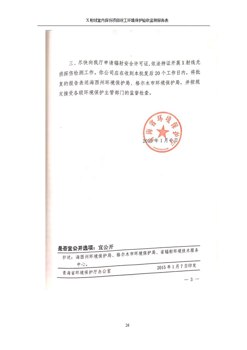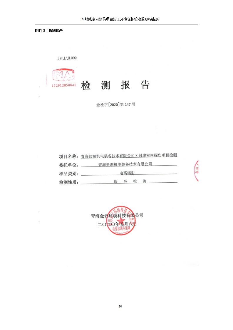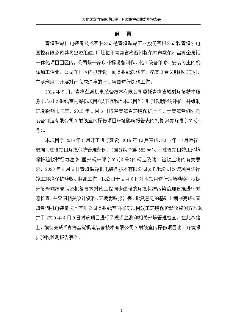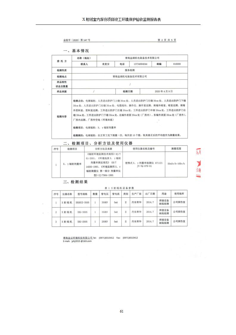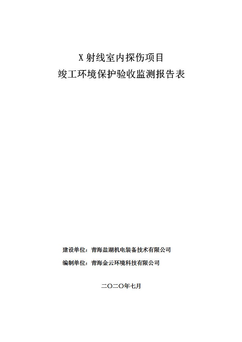 青海鹽湖機(jī)電裝備技術(shù)有限公司X射線室內(nèi)探傷項(xiàng)目竣工環(huán)境保護(hù)驗(yàn)收監(jiān)測(cè)報(bào)告表公示發(fā)布日期:(2020-7-10) 點(diǎn)擊次數(shù):3482 |