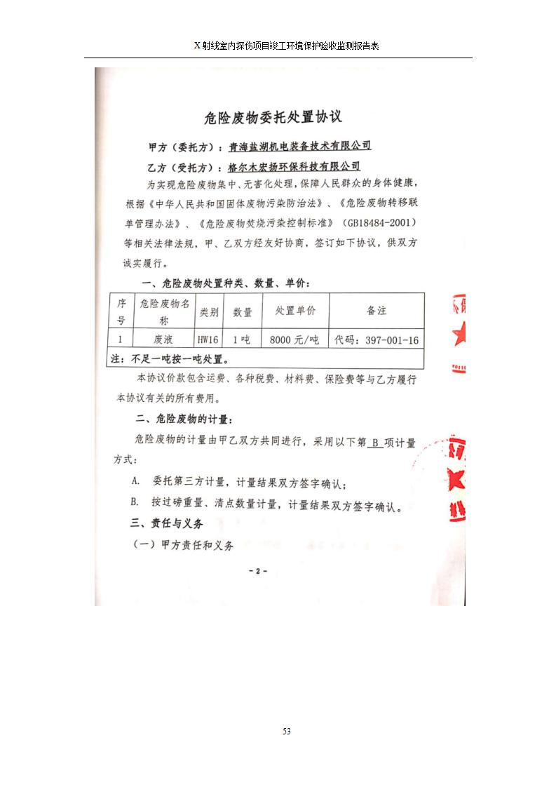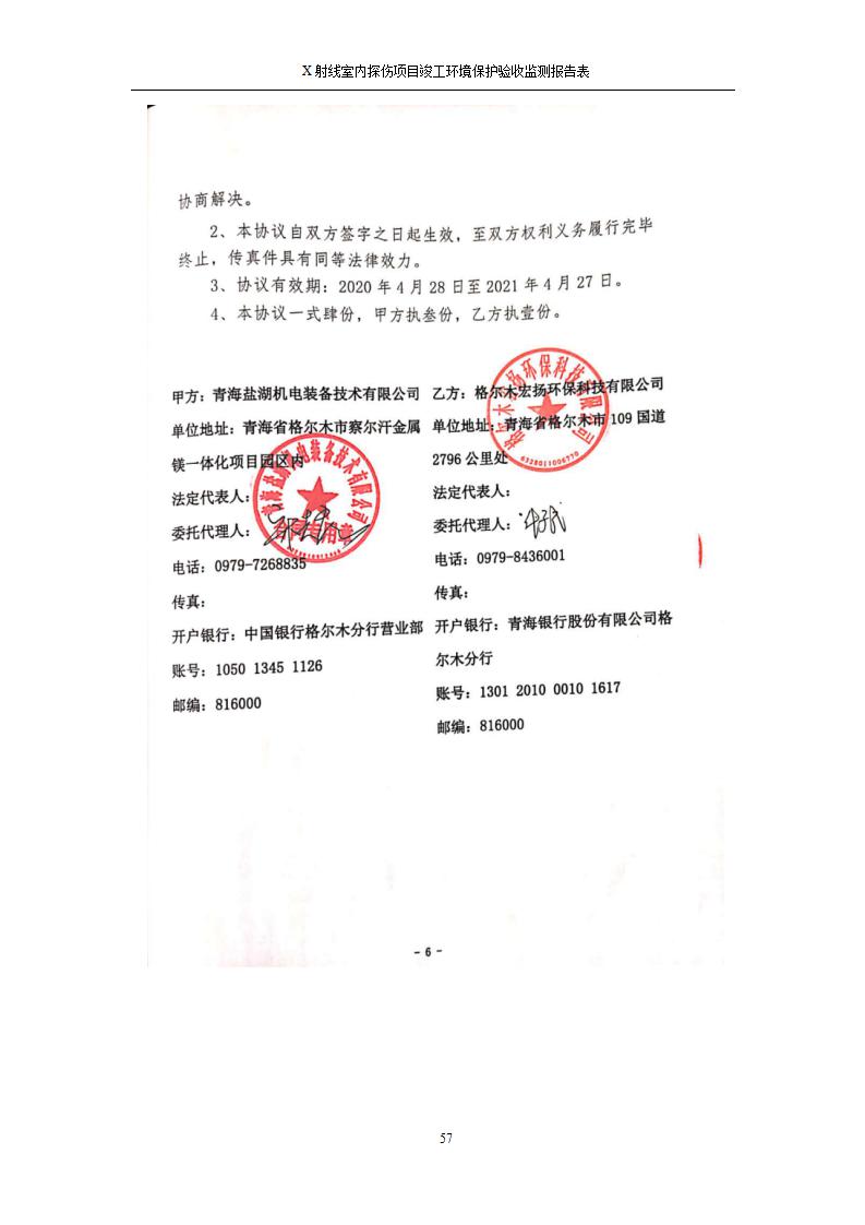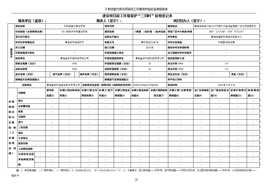 根據(jù)中華人民共和國(guó)國(guó)務(wù)院令第682號(hào)《國(guó)務(wù)院關(guān)于修改〈建設(shè)項(xiàng)目環(huán)境保護(hù)管理?xiàng)l例〉的決定》和《建設(shè)項(xiàng)目竣工環(huán)境保護(hù)驗(yàn)收暫行辦法》(國(guó)務(wù)院令682號(hào)),青海鹽湖機(jī)電裝備技術(shù)有限公司X射線室內(nèi)探傷項(xiàng)目竣工環(huán)境保護(hù)驗(yàn)收監(jiān)測(cè)報(bào)告表公示如下。 一、項(xiàng)目名稱(chēng):X射線室內(nèi)探傷項(xiàng)目竣工環(huán)境保護(hù)驗(yàn)收監(jiān)測(cè)報(bào)告表 二、地點(diǎn):青海省海西州格爾木市察爾汗鹽湖金屬鎂一體化項(xiàng)目園區(qū)內(nèi) 三、建設(shè)單位:青海鹽湖機(jī)電裝備技術(shù)有限公司 四、建設(shè)內(nèi)容:本項(xiàng)目位于公司三號(hào)車(chē)間廠房?jī)?nèi),探傷室長(zhǎng)21m,寬9.3m,共有3臺(tái)X射線探傷機(jī)。 五、聯(lián)系人:楊工 六、聯(lián)系電 話:0971-6515411 七、公示時(shí)間:二〇二〇年七月十日至二〇二〇年八月六日 公示期間,對(duì)上述公示內(nèi)容如有異議,請(qǐng)以書(shū)面形式反饋,個(gè)人須署真實(shí)姓名,單位須加蓋公章。